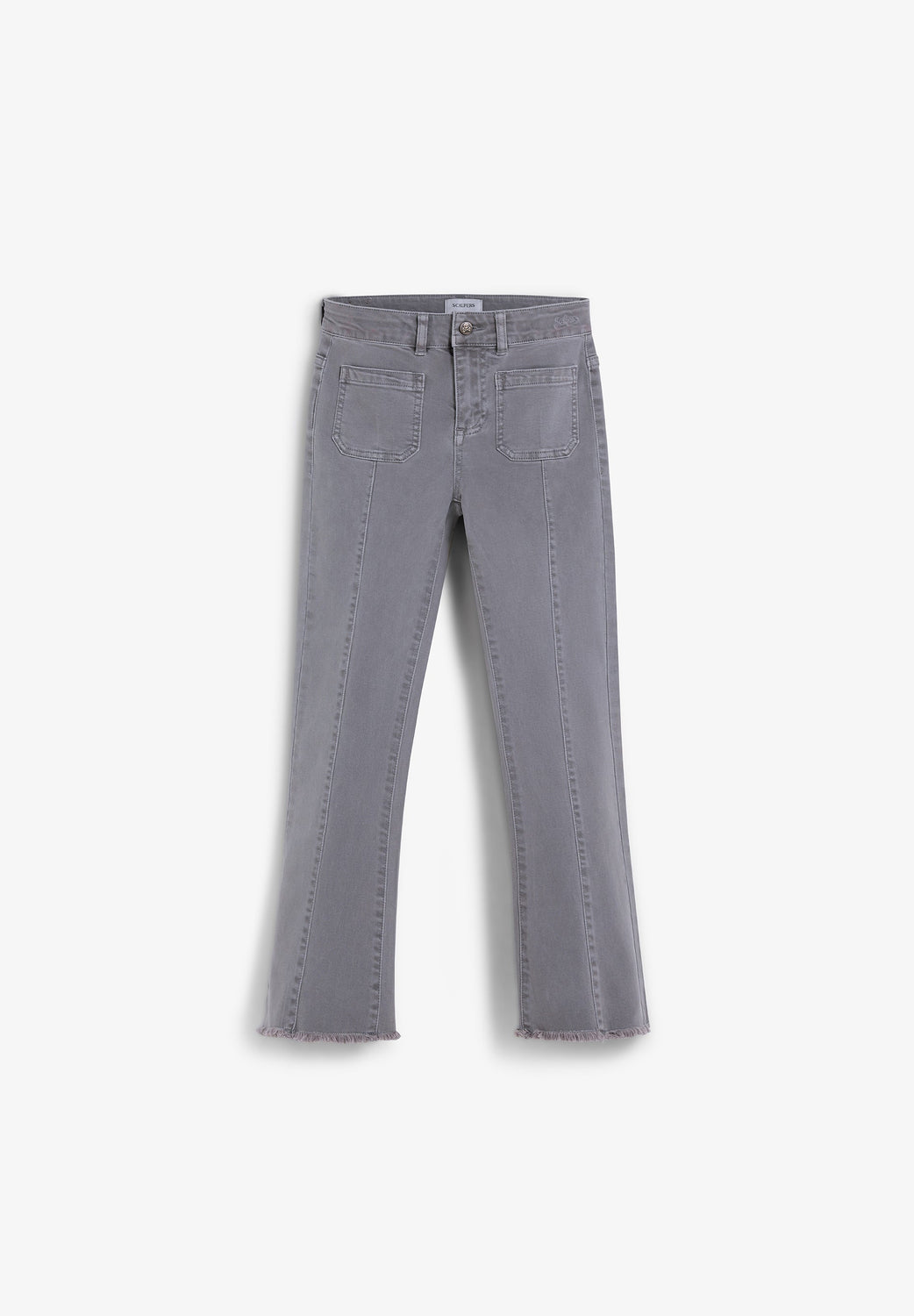 Flared trousers made of BCI cotton. Button and zip fastening. Belt loops at the waist. Front and back pockets. Seam detail on the front. Side slit and frayed hems.