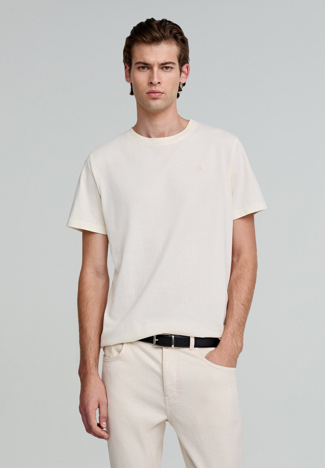 An essential everyday T-shirt crafted from 100% cotton, designed in a regular fit with a classic round neckline and short sleeves, finished with a subtle embroidered skull detail.