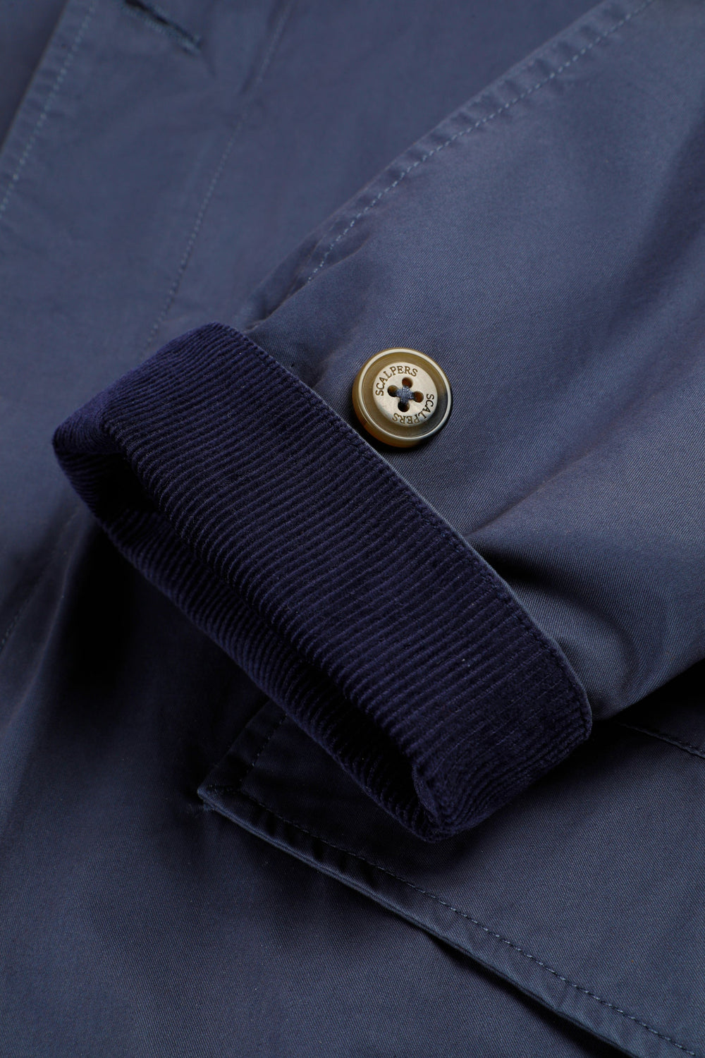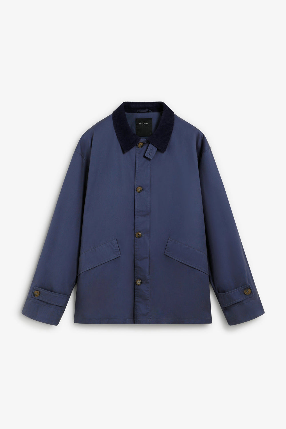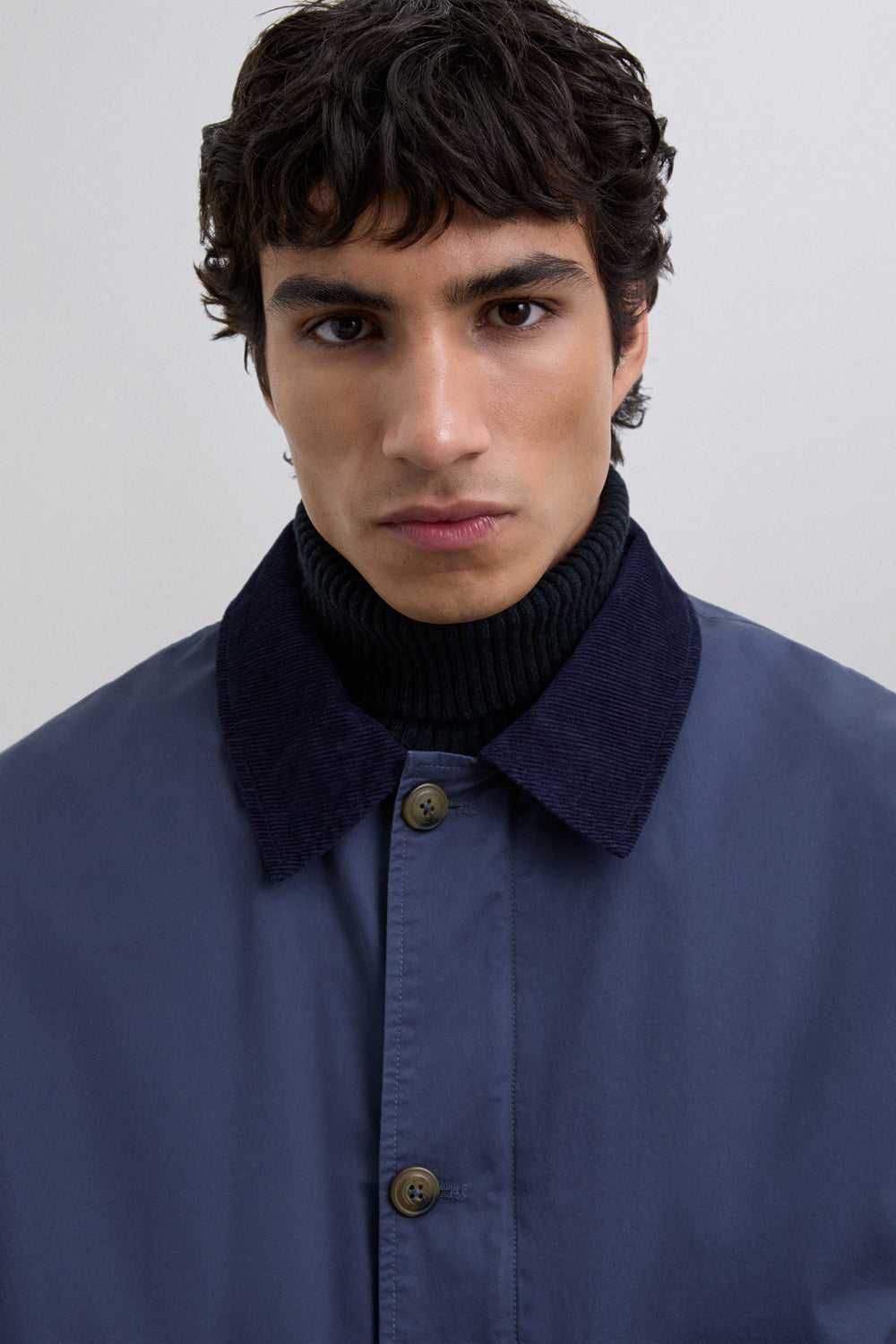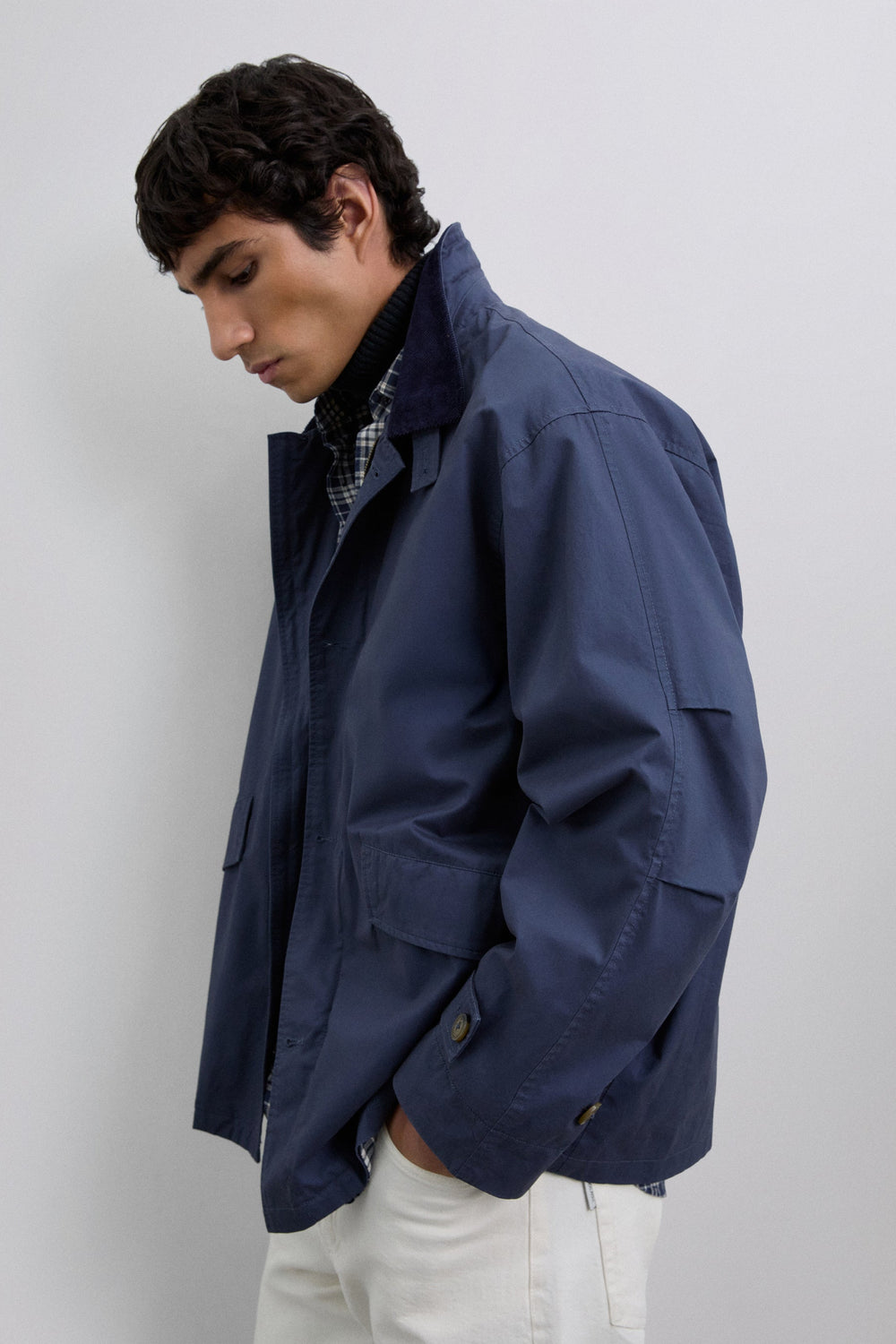 Jacket made of 100% BCI cotton. Front zip and button fastening, both customised. Corduroy shirt collar with buttoned tab. Long sleeves. Corduroy details on sleeve openings. Front slant pockets. Wider cut. Adjustable sleeve tab with double button.