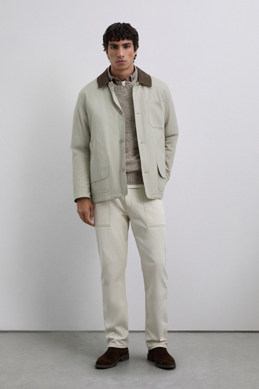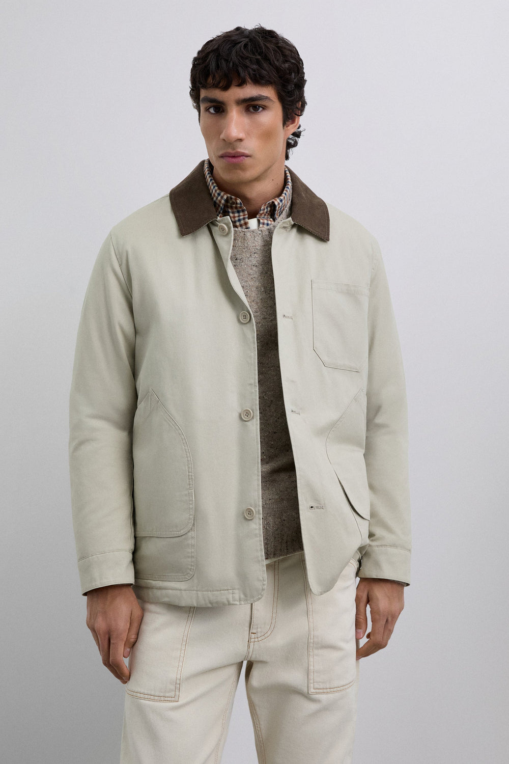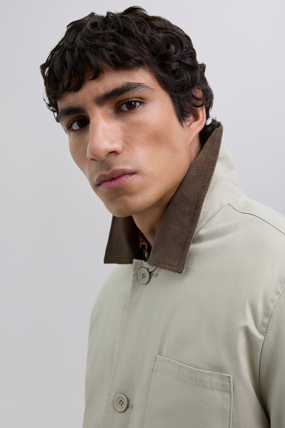 Jacket made of 100% cotton. Contrast corduroy collar. Button fastening. Chest patch pocket and two side slanted pockets. Long sleeves. Cuffs with button fastening.
