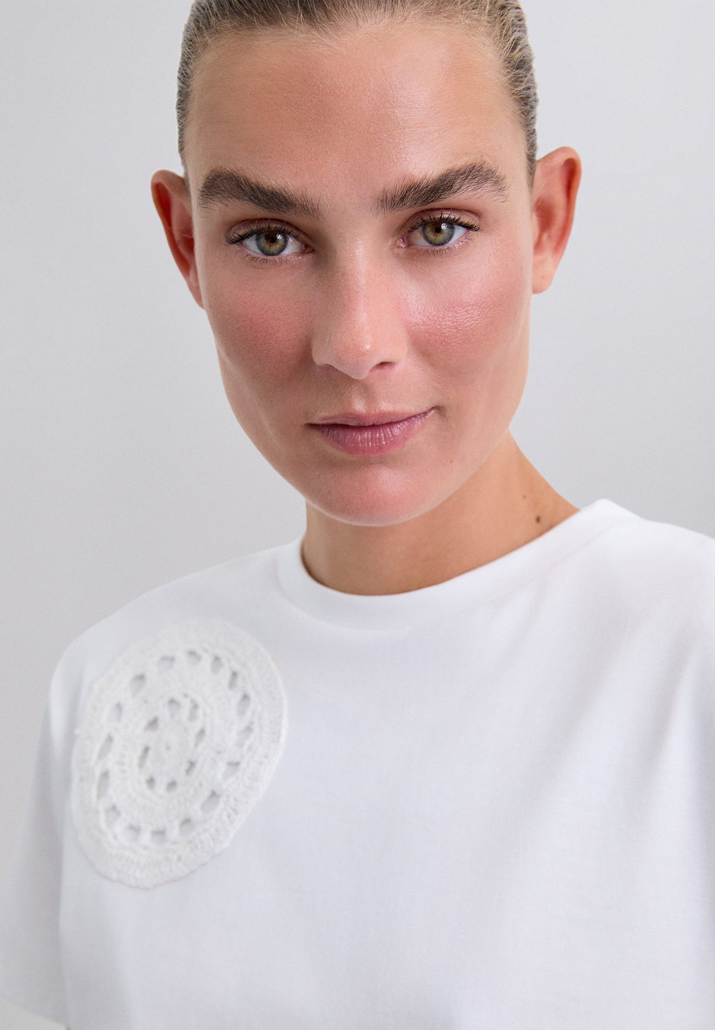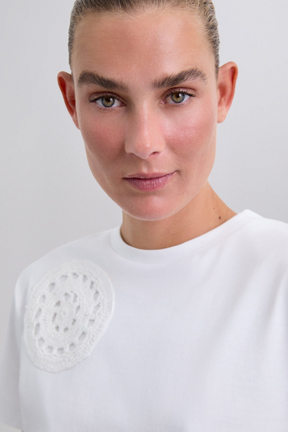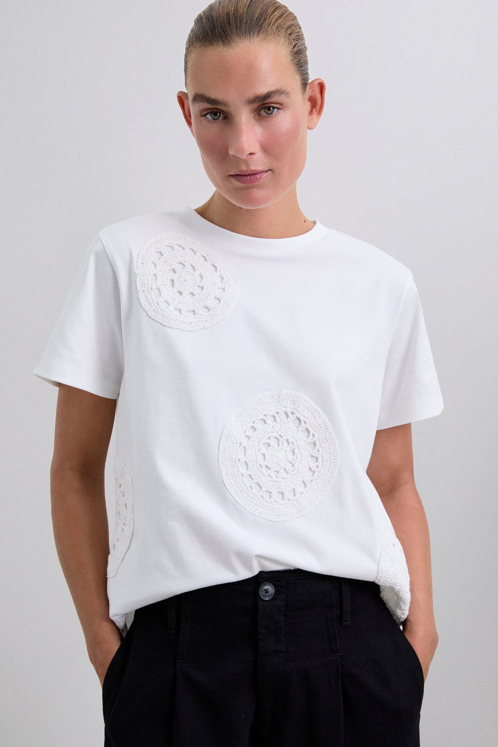 T-shirt made of 100% BCI cotton. Crochet motifs on chest and back. Regular fit, round neck and short sleeves.