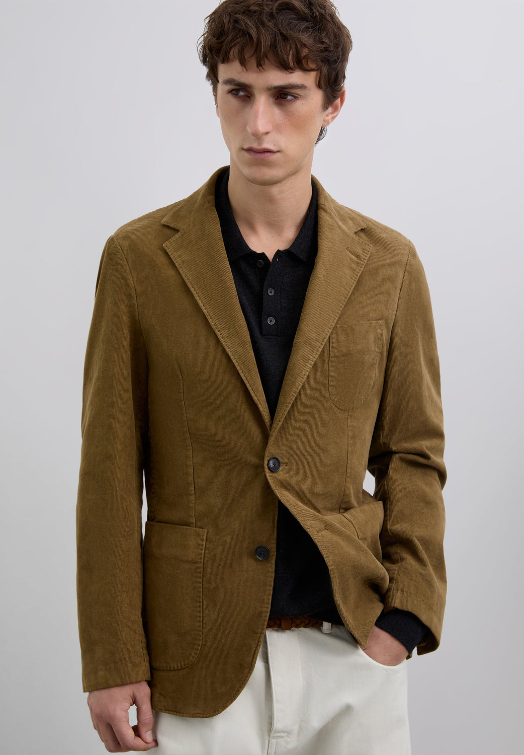 Blazer made of slightly stretchy corduroy fabric. Regular fit. Notched lapel collar. Button fastening. Sleeves with buttoned cuffs. Patch pockets.