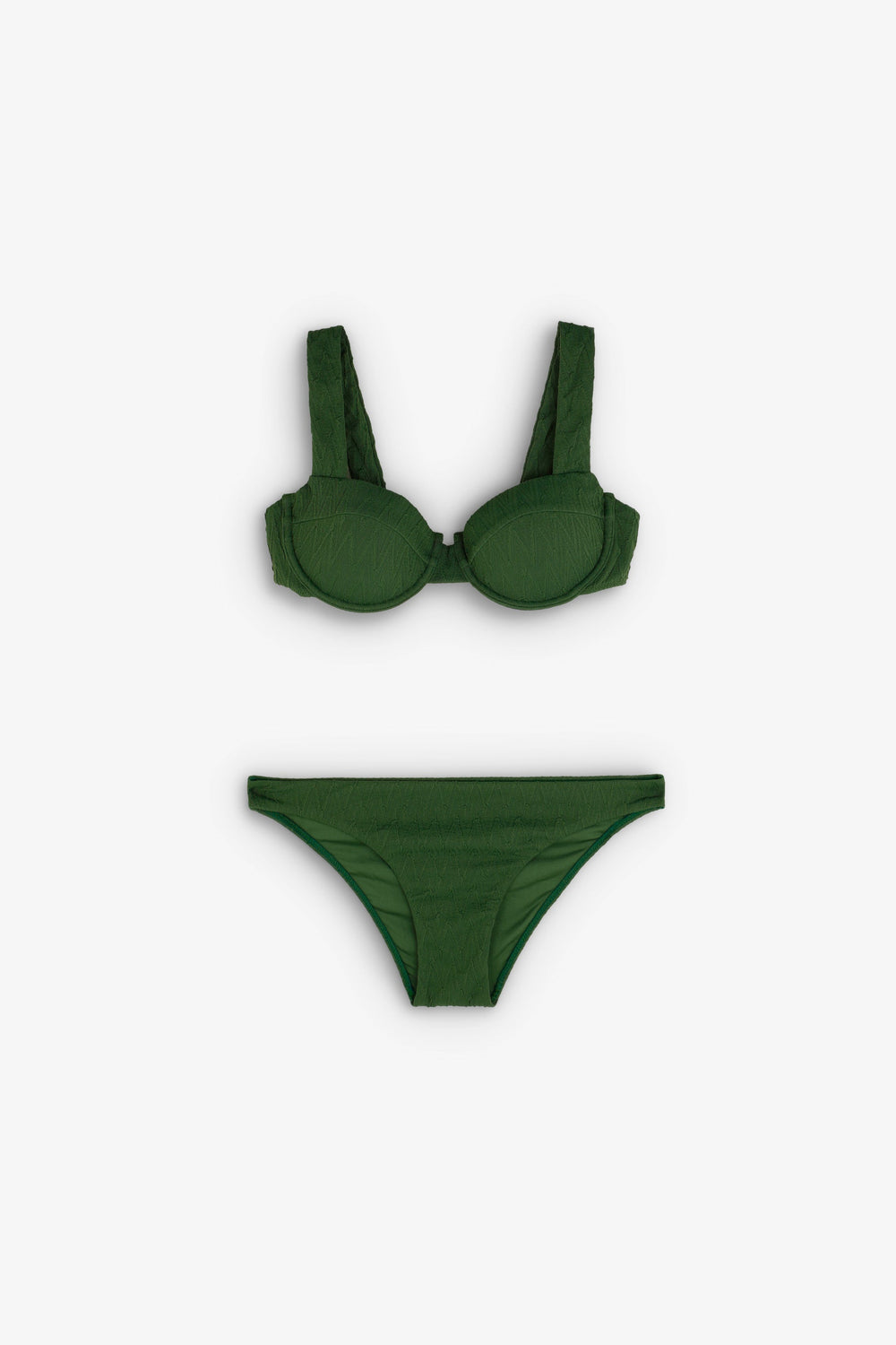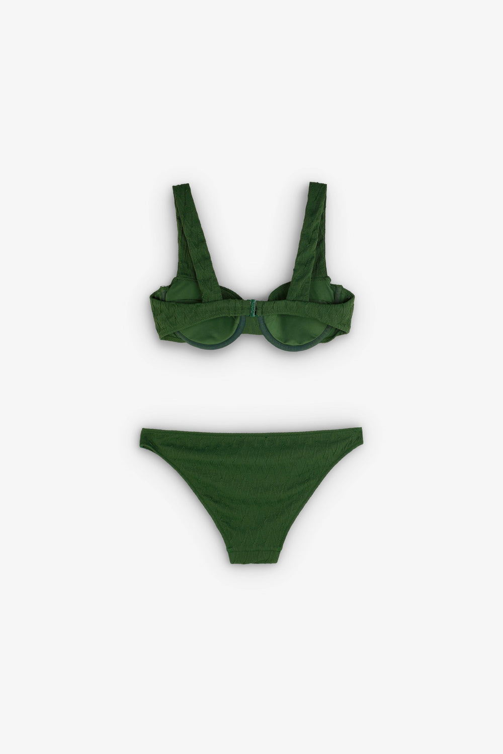 This bikini is designed in collaboration with Scalpers and belongs to the ROBIN x SCALPERS collection.  This is a Balconette Bikini with a zig zag structure in dark green. It has an underwire, removable foam pads and wide straps for perfect support, with a multi-position hook-and-eye fastening at the back for a better fit. Bottom with classic coverage and side ties, fully lined. Also available with a classic cover bottom without ties.