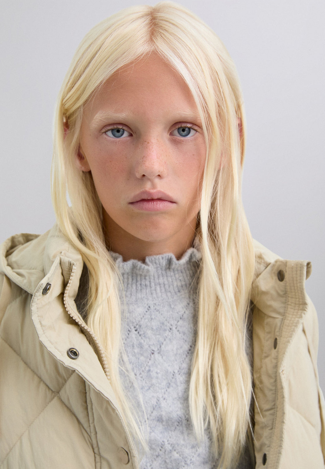 Padded coat. Detachable hood and sleeves. Front zip fastening concealed by placket with press stud fastening. Side pockets. Recycled fleece lining. Logo detail on the back.