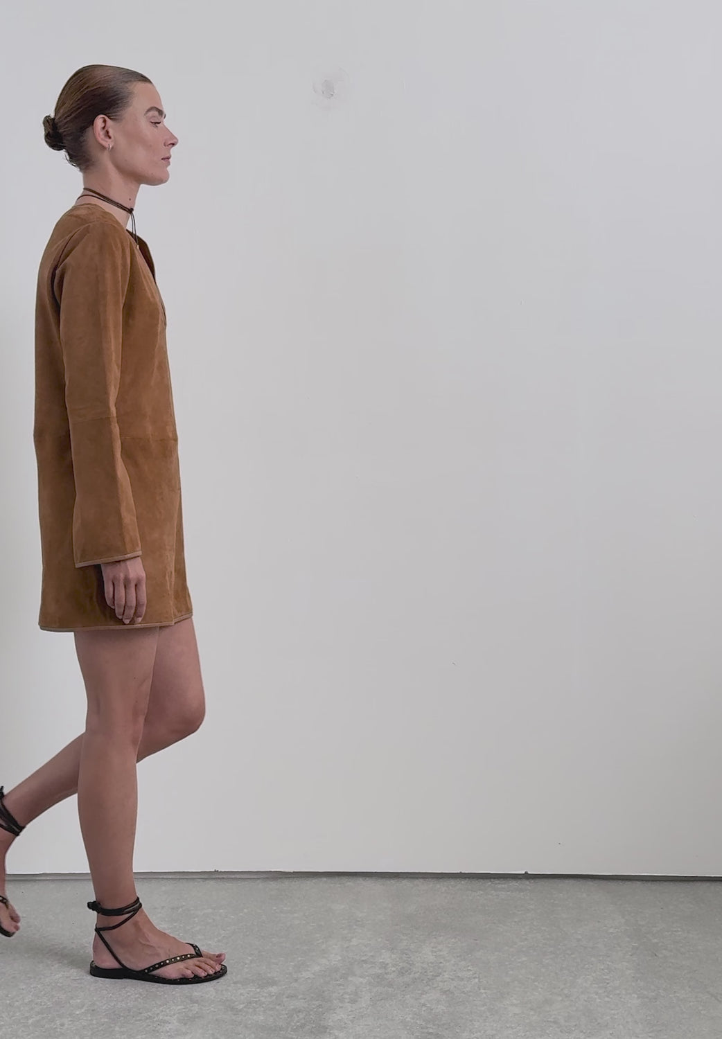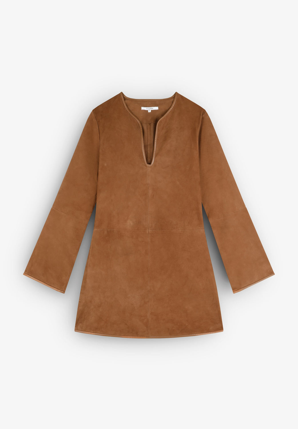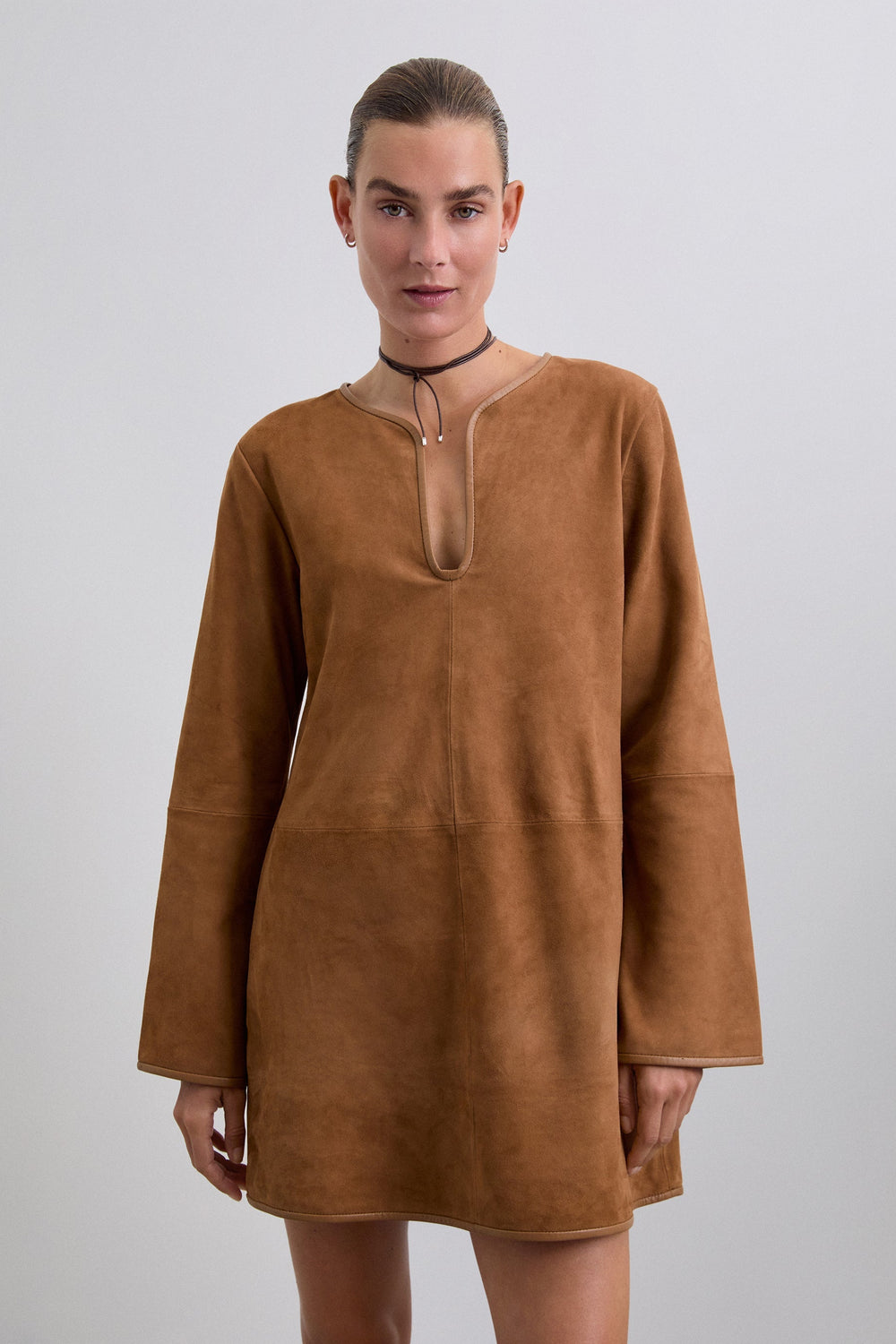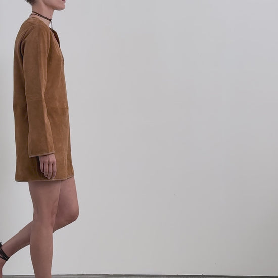 Mini dress made in goatskin with suede finish. Crew neck. Slightly flared long sleeves. Piping and stitching details around the neckline, sleeves and hem.