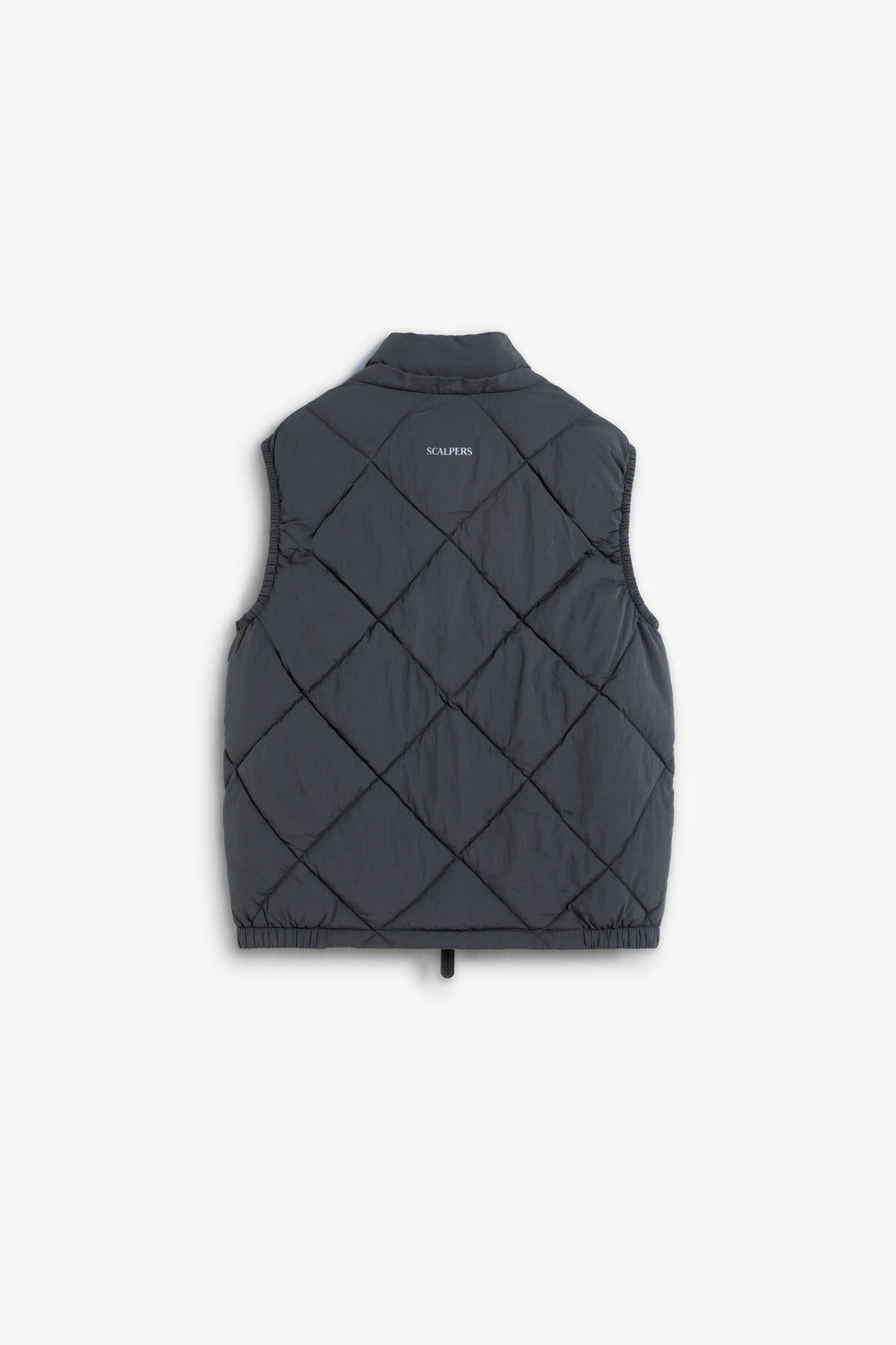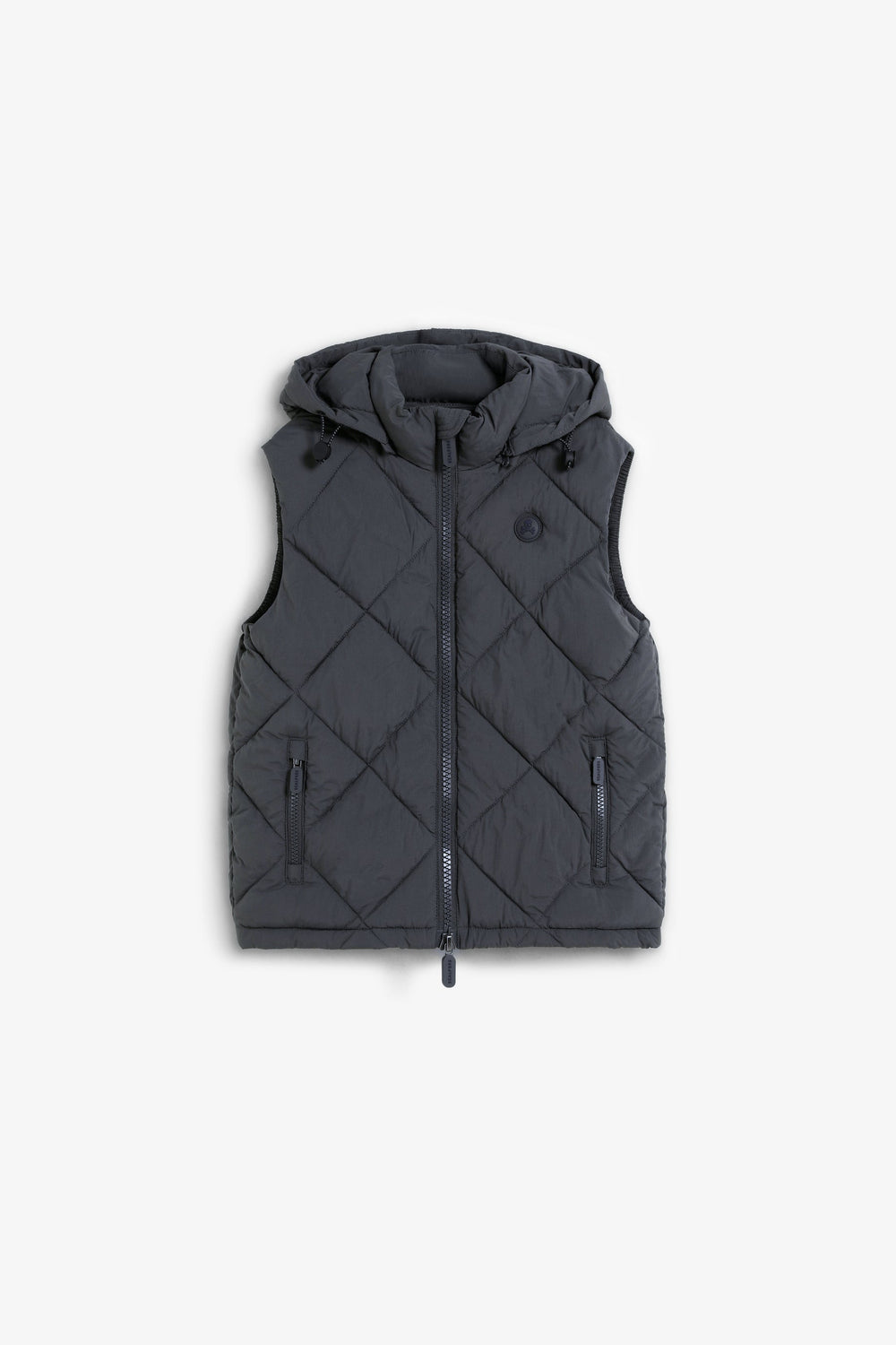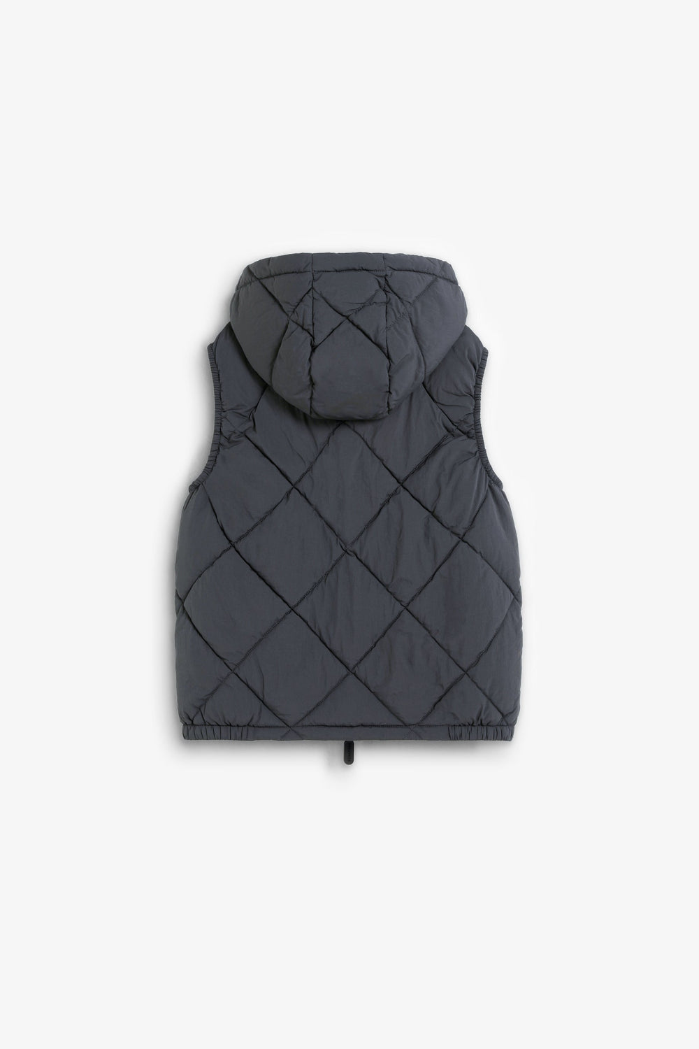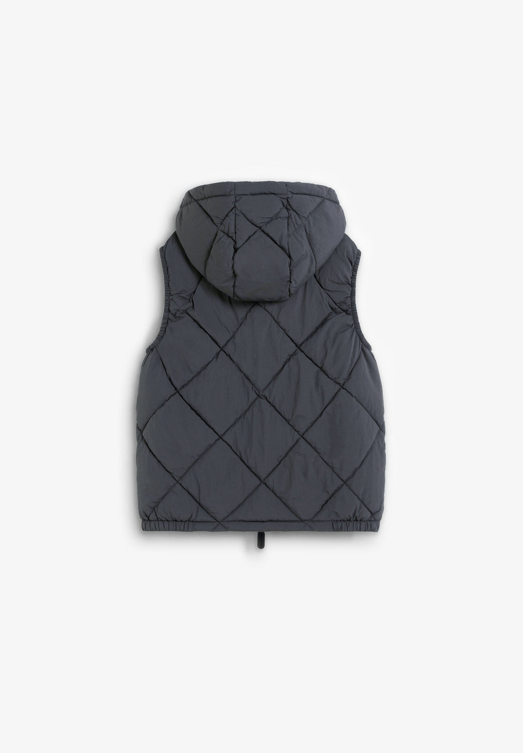Heavy-duty padded waistcoat with adjustable hood. Double slider zip fastening. Rubberised skull detail on chest. Zip pockets and an inner pocket