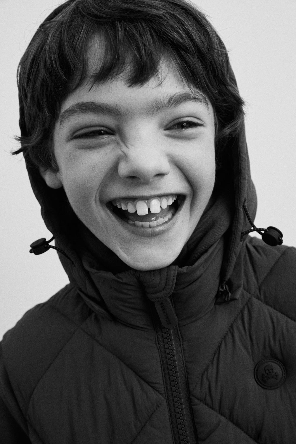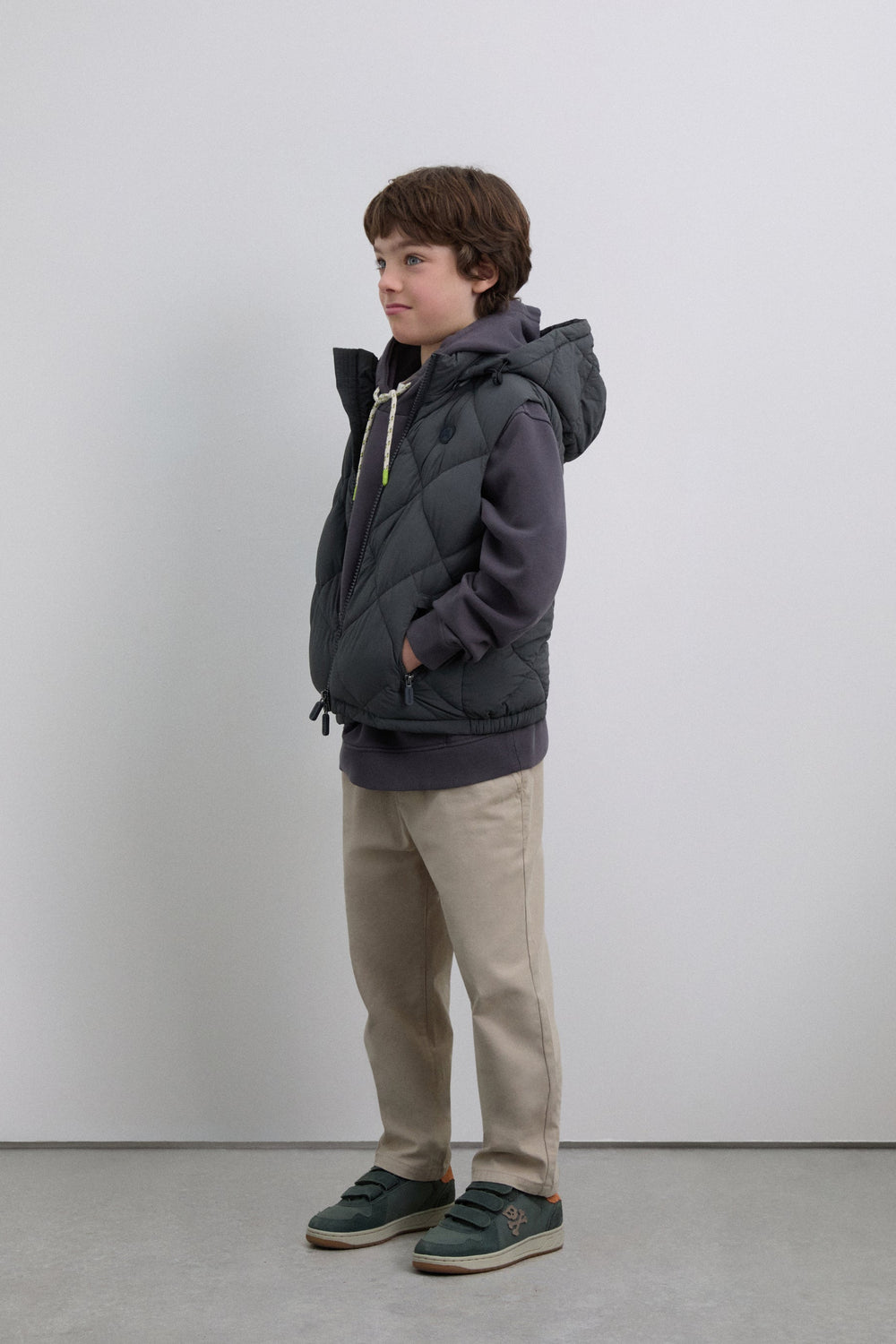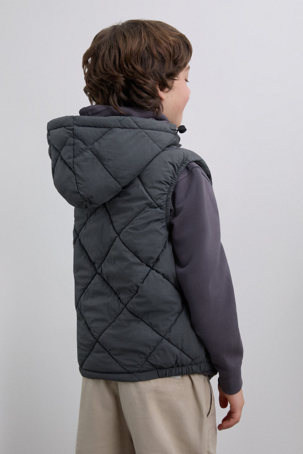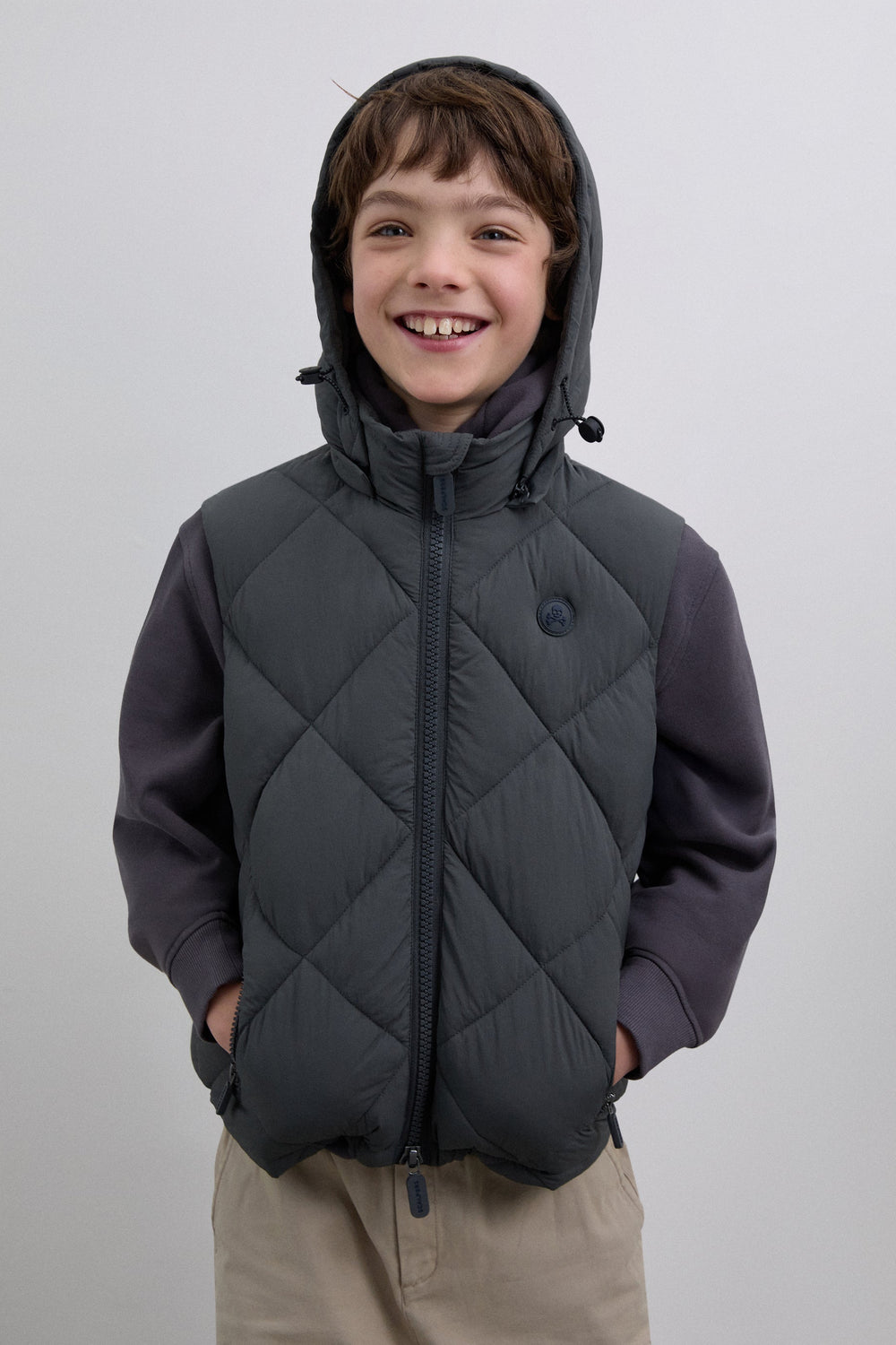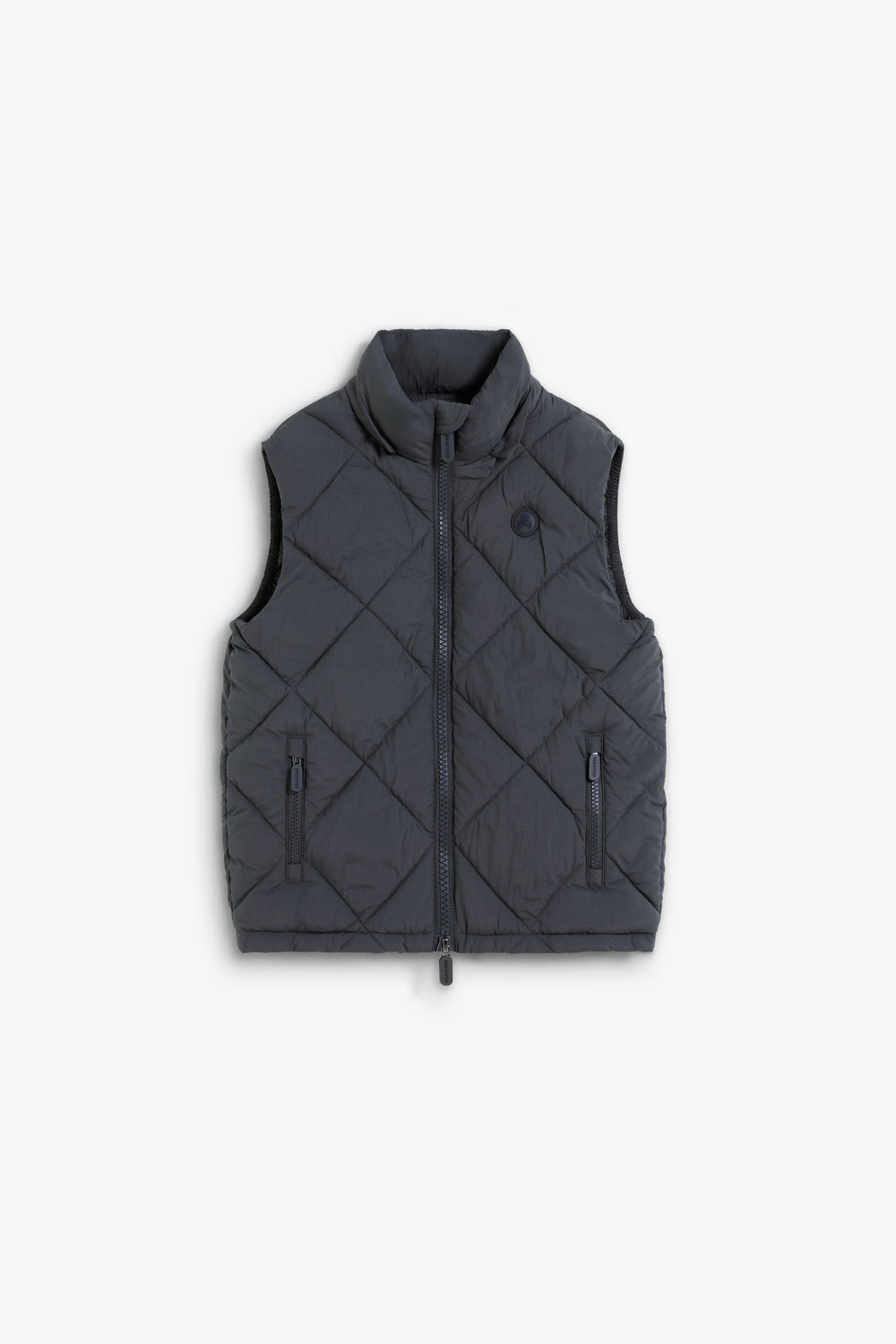 Heavy-duty padded waistcoat with adjustable hood. Double slider zip fastening. Rubberised skull detail on chest. Zip pockets and an inner pocket