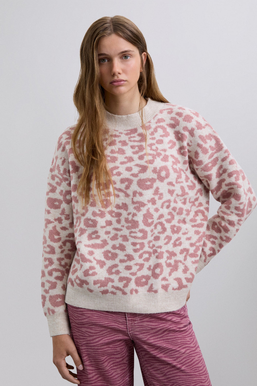 Knit sweater. Long sleeves. Round neck. Animal print. Contrast ribbed finish.