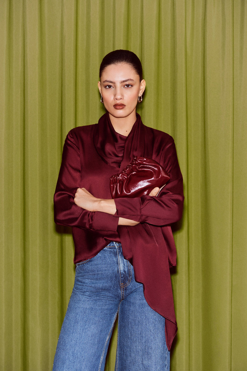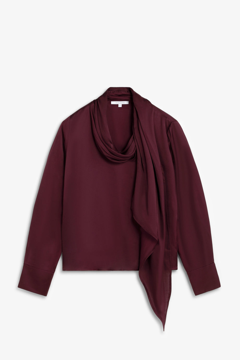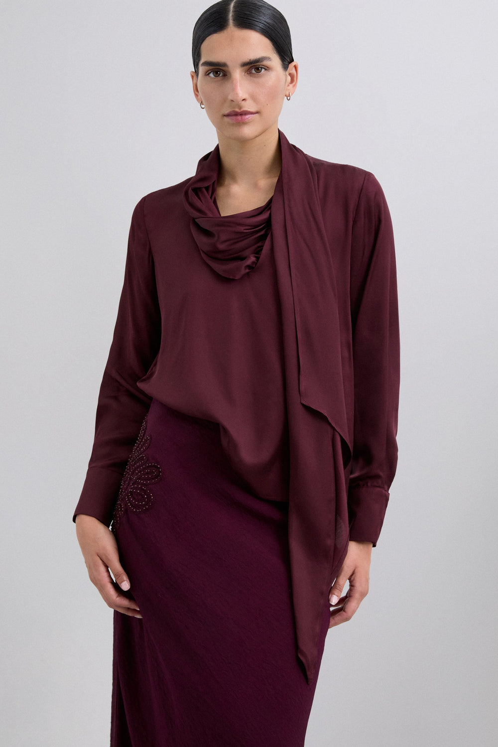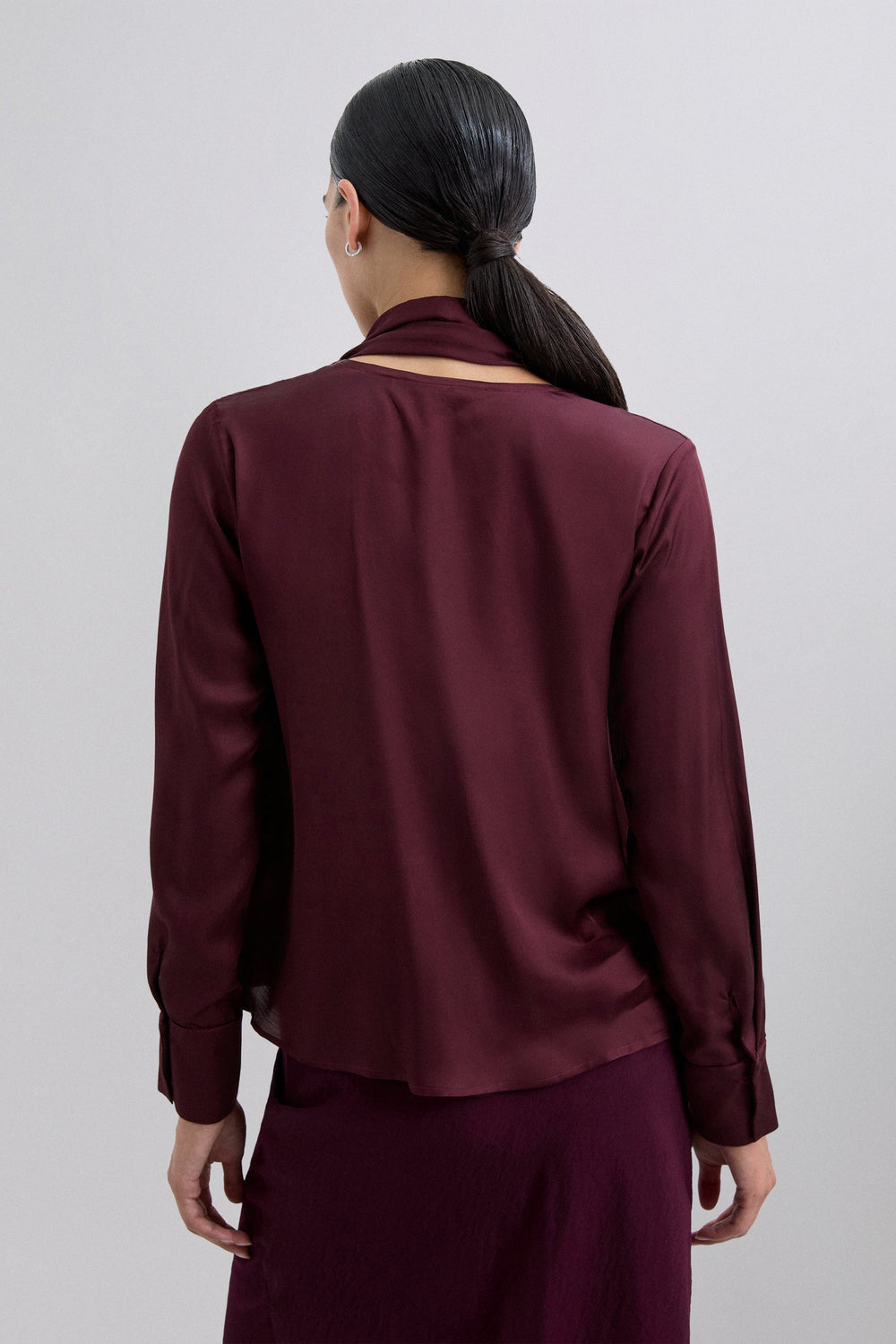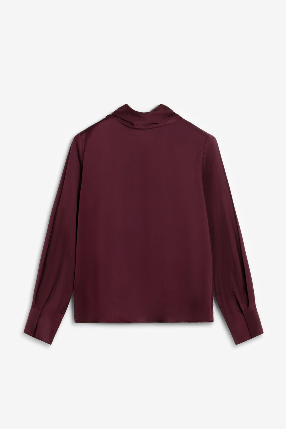 Satijnen blouse met lange mouwen. Gedrapeerde kraag en verstelbare strik.
