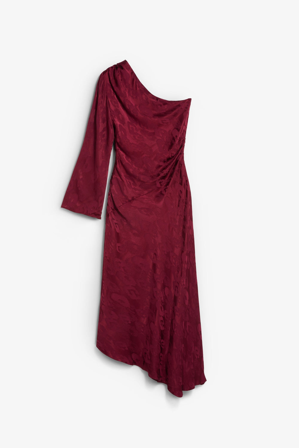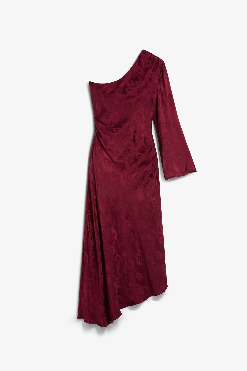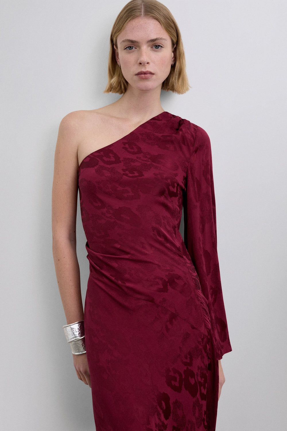 Satijnachtige asymmetrische jurk. Jacquardprint. Lange asymmetrische mouw. Asymmetrische soepelvallende zoom.