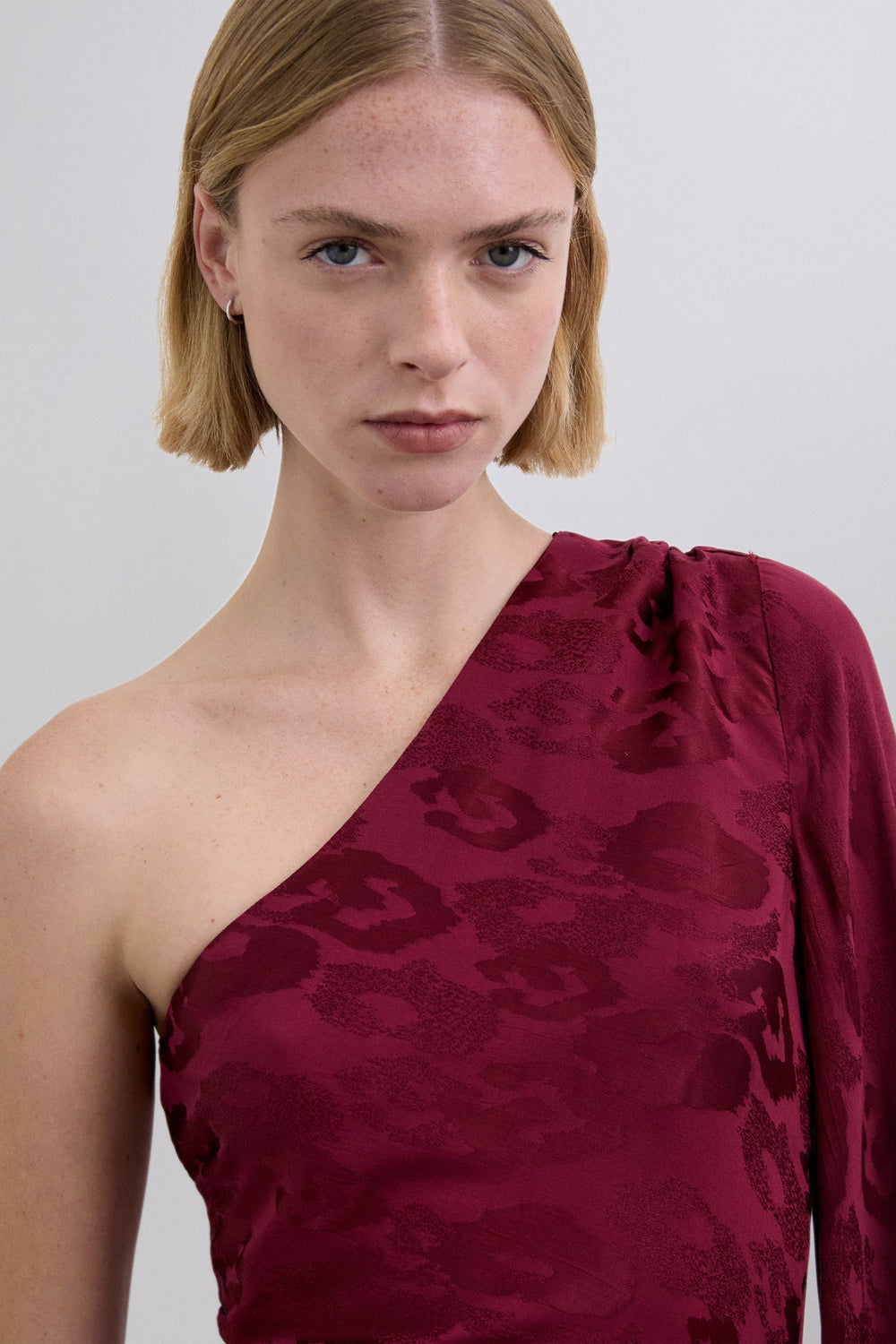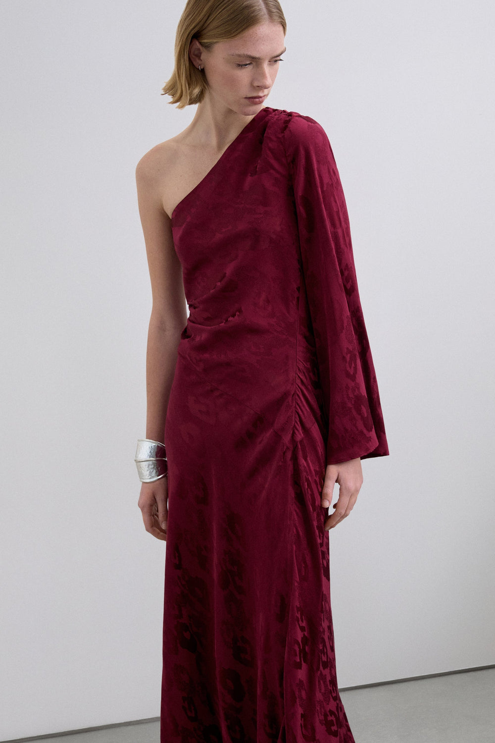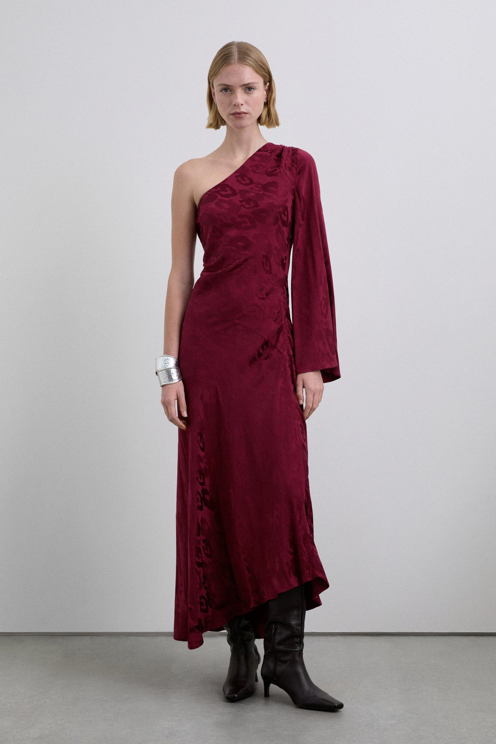 Satijnachtige asymmetrische jurk. Jacquardprint. Lange asymmetrische mouw. Asymmetrische soepelvallende zoom.