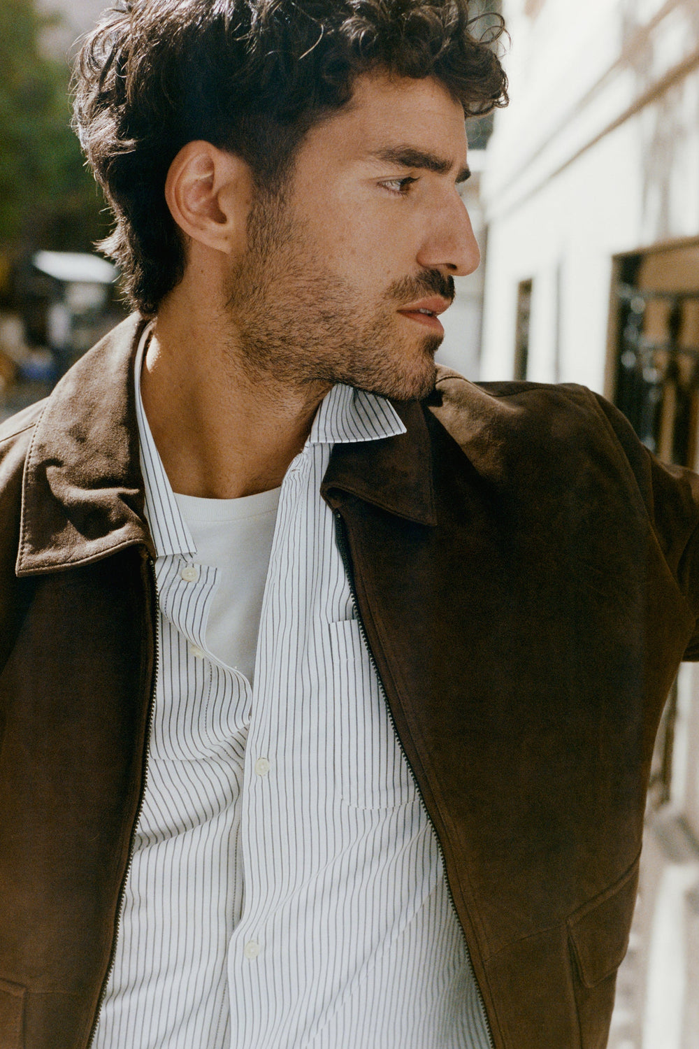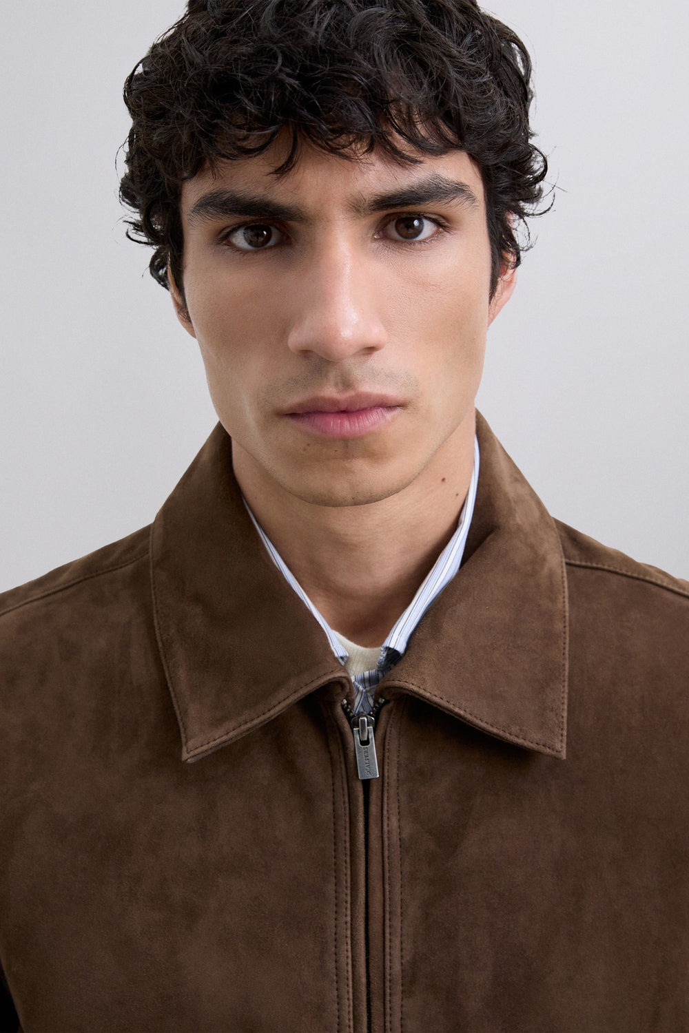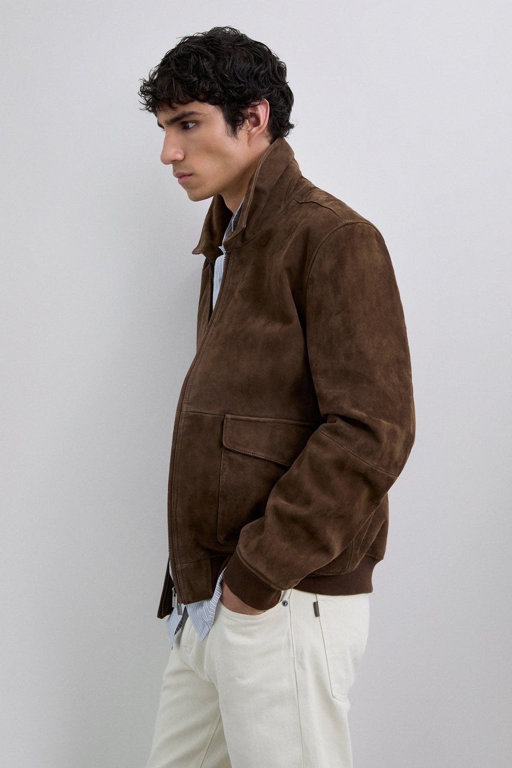 Suède jack met overhemdkraag. Dubbele ritssluiting aan de voorkant. Geribde manchetten en zoom. Twee klepzakken met ritssluiting aan de voorkant.